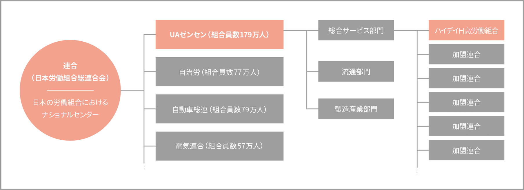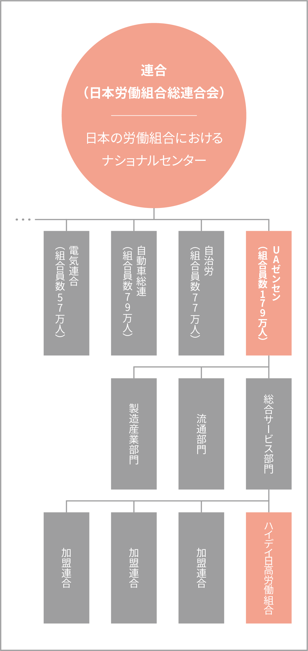 ハイデイ日高労働組合は、UAゼンセンという上部団体に加盟しています。UAゼンセンには、フードサービスやホテル・レジャー(サイゼリヤやオリエンタルランドなど)が含まれる総合サービス部門の他、スーパーや百貨店(マルエツや髙島屋など)といった流通部門、繊維・衣料・医薬・化粧品などの製造産業部門の労働組合が加盟しており、約179万名で構成される日本最大の複合産別組織です。また、UAゼンセンへ加盟することによって、さまざまな特典を受けることができます。
