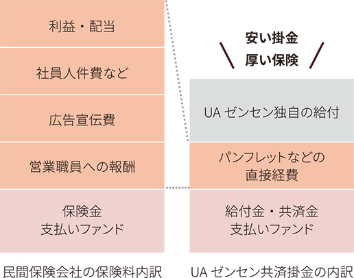 民間の保険会社は利益を追求しなければなりません。 加えて宣伝や人件費などの経費もかかります。その点、 UAゼンセンの共済は利益を追求せず、人件費や営業経費等のコストカットなどで、掛金を少しでも安くする努力を行っています。加入者が増大すれば、さらに掛金は下がるという仕組みですから、みなさまの加入によって、さらに安くすることができます。